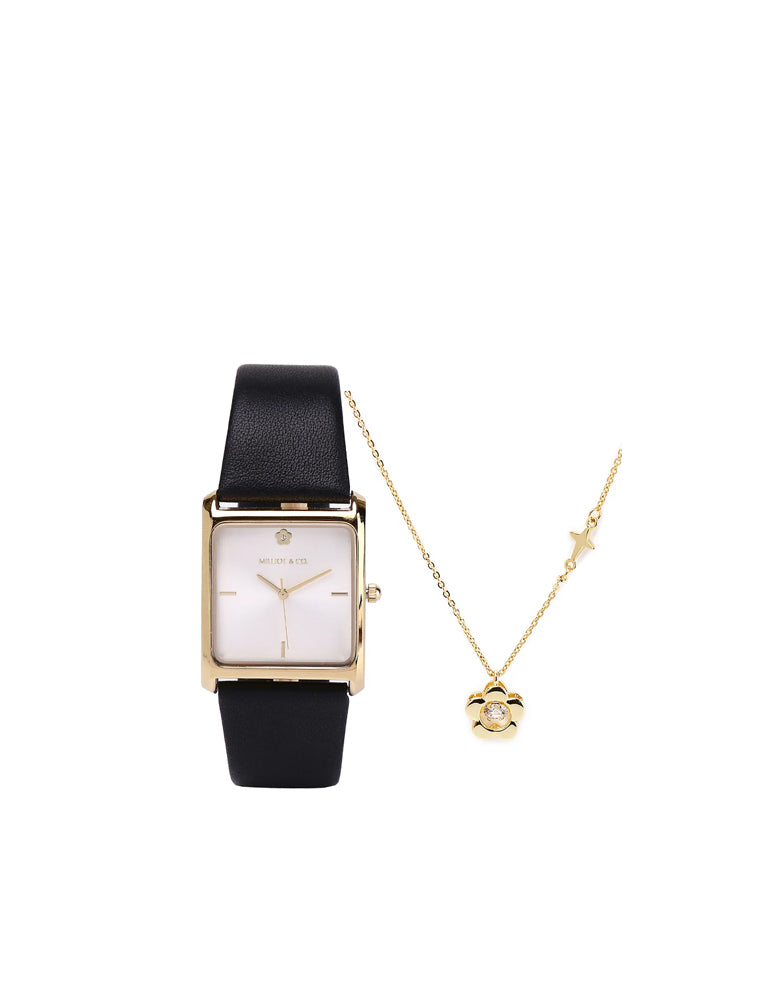 Atharis Gold Leather Watch with Necklace Set (Black)