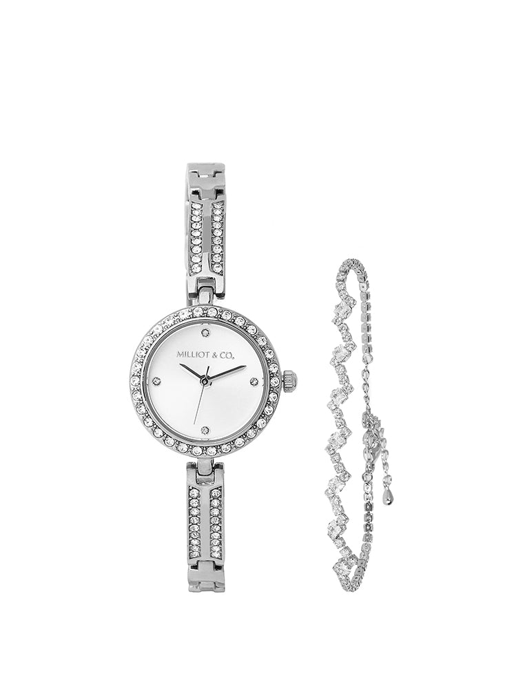 Sora Rhinestone Analog Watch with Bracelet Set (Silver)