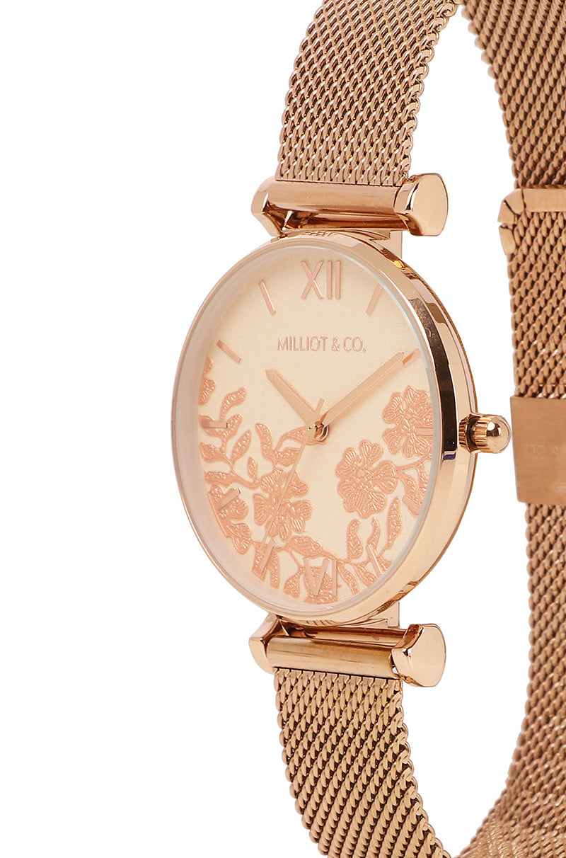 Embrace timeless beauty with the BlossomTime Elegance, a captivating women's watch that blends delicate floral motifs with modern sophistication. Designed to complement your elegant style, this exquisite timepiece features a 36mm round case, a cream-colored dial adorned with floral decorations, and a luxurious mesh strap.