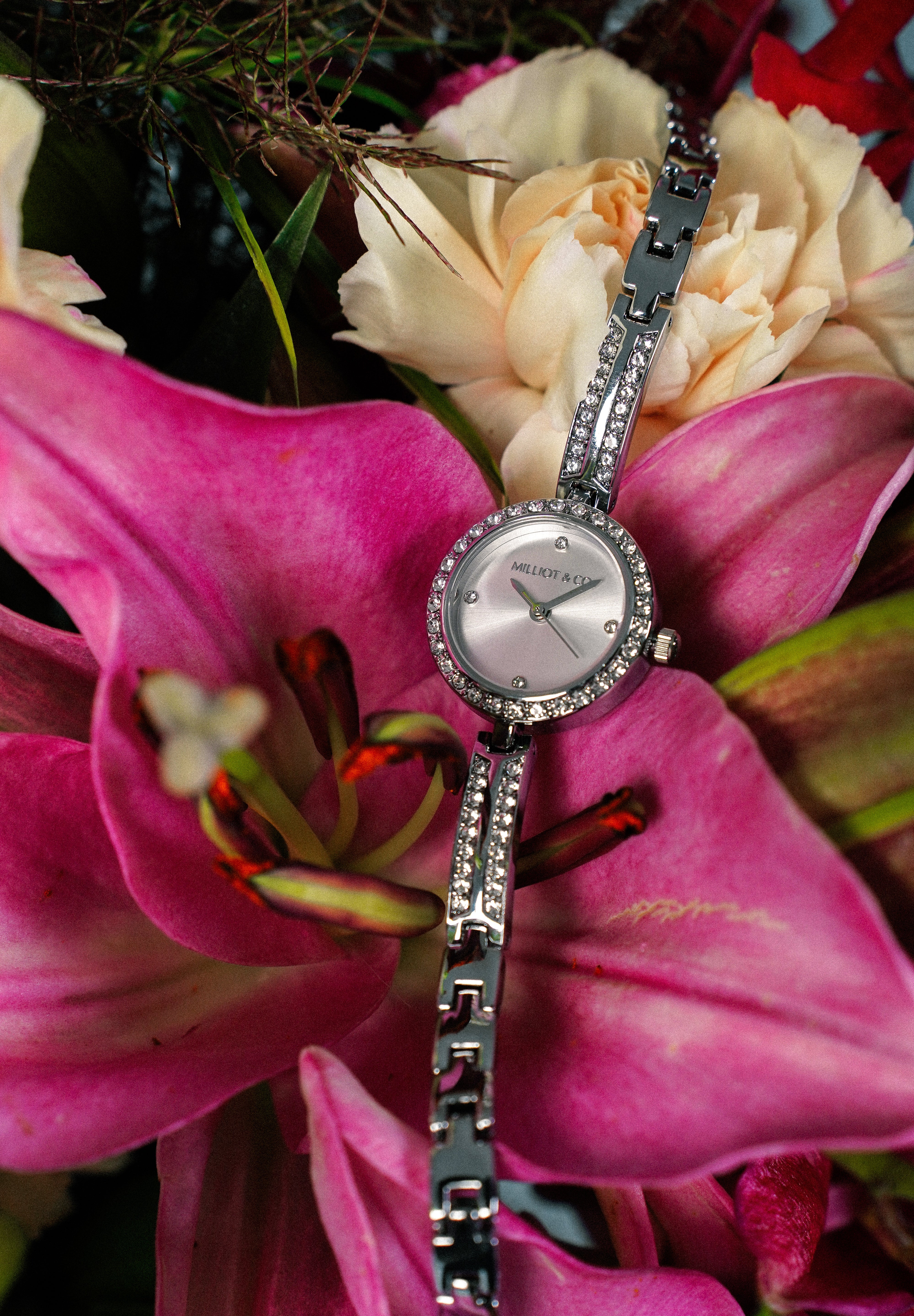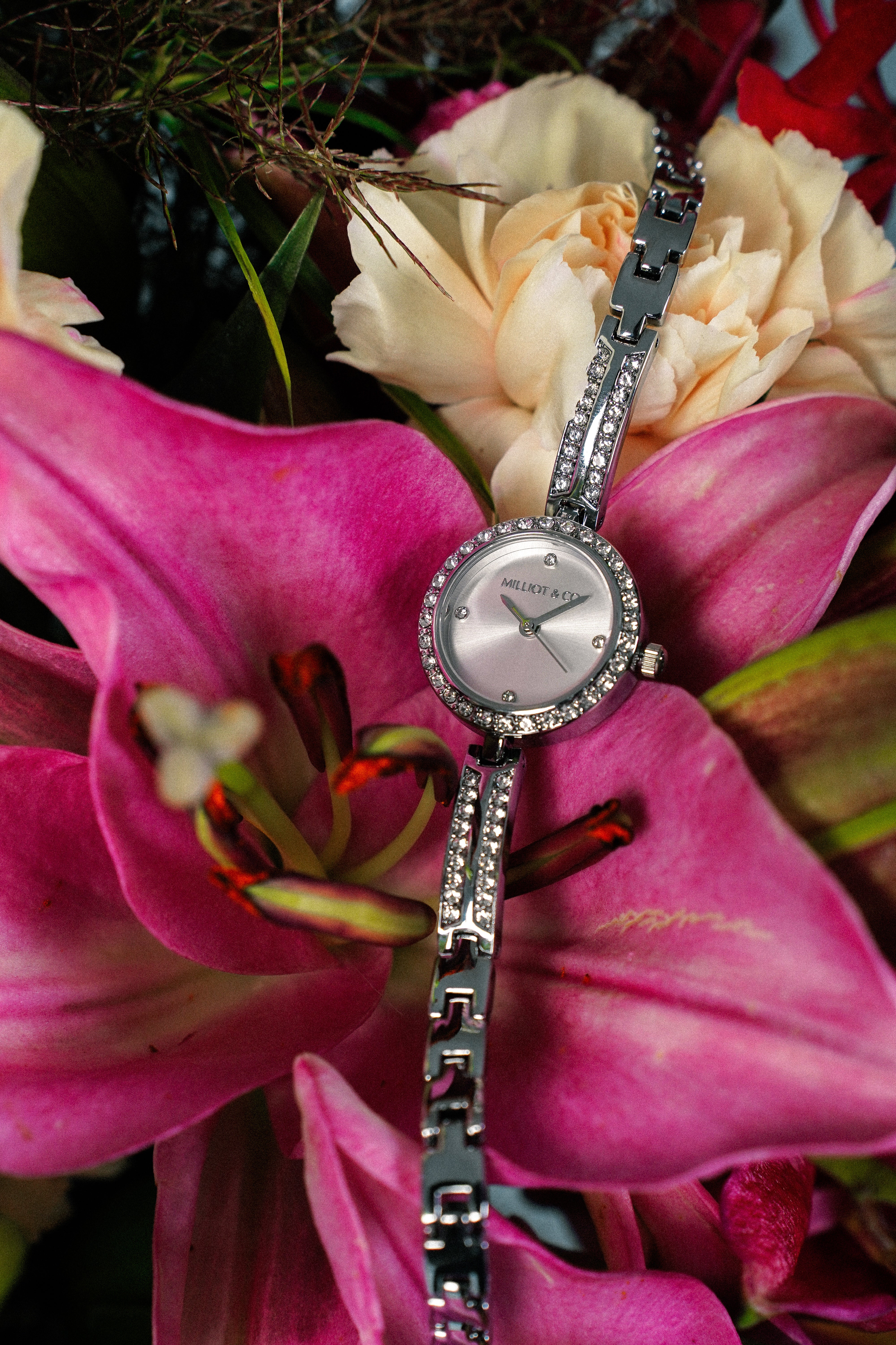 - Dial color: Silver with decorative rhinestone