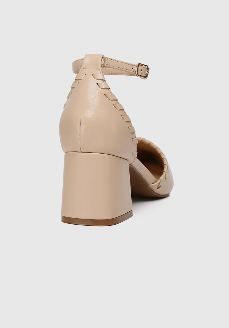 - Solid tone weaved trim details mid heels