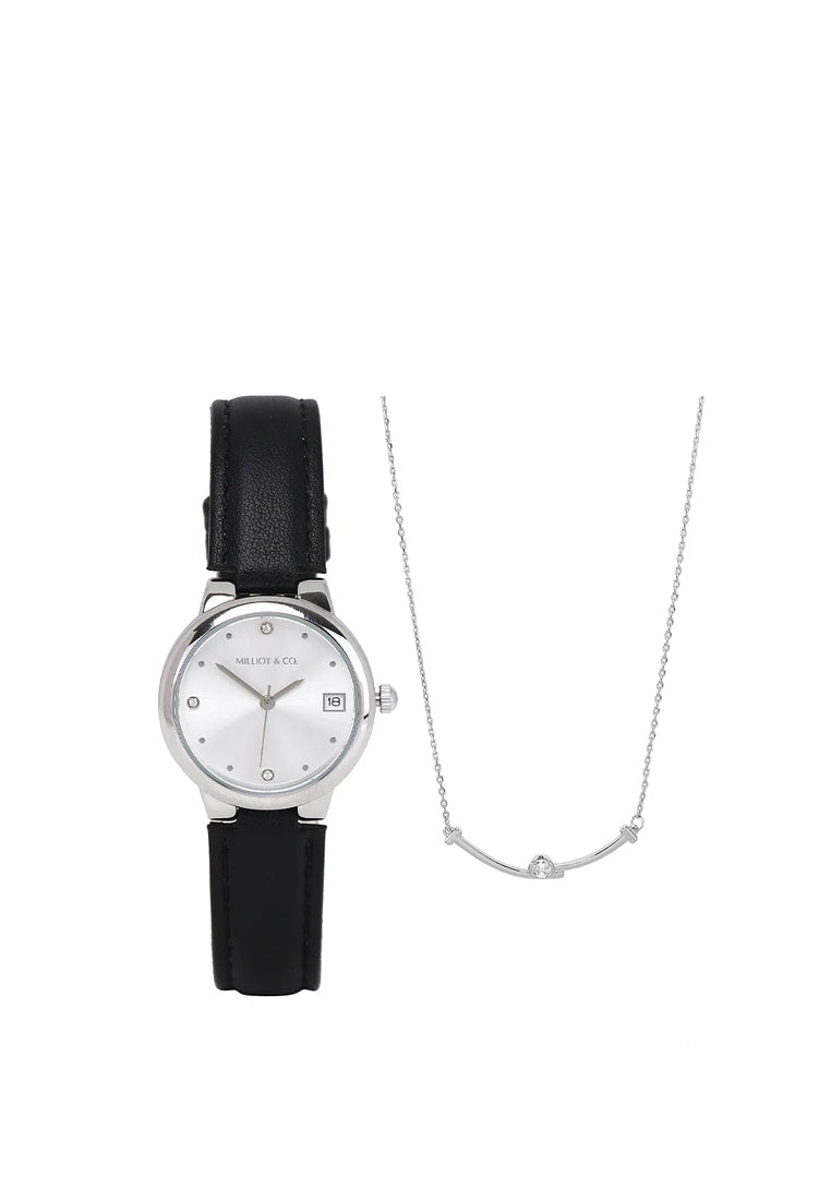 Complete your look with this 30mm round-shaped watch, now available with a matching necklace edition. Featuring a genuine leather strap and a sleek dial with an added date function, this watch offers timeless style and practicality. Paired with an elegant necklace, this set is perfect for elevating any outfit, making it an ideal choice for both everyday wear and special occasions.