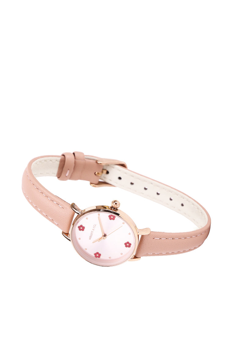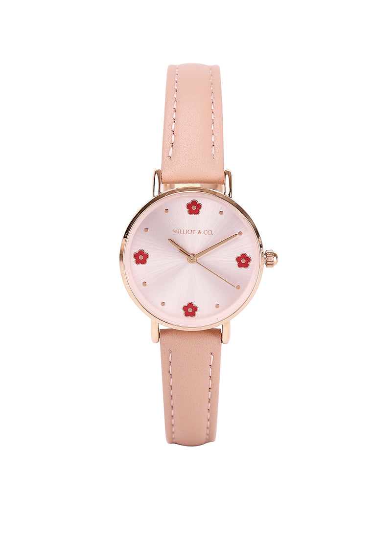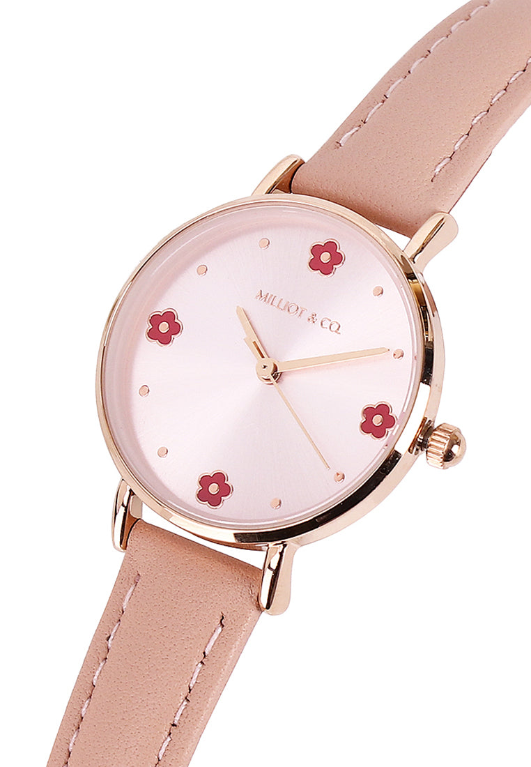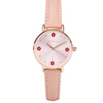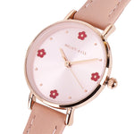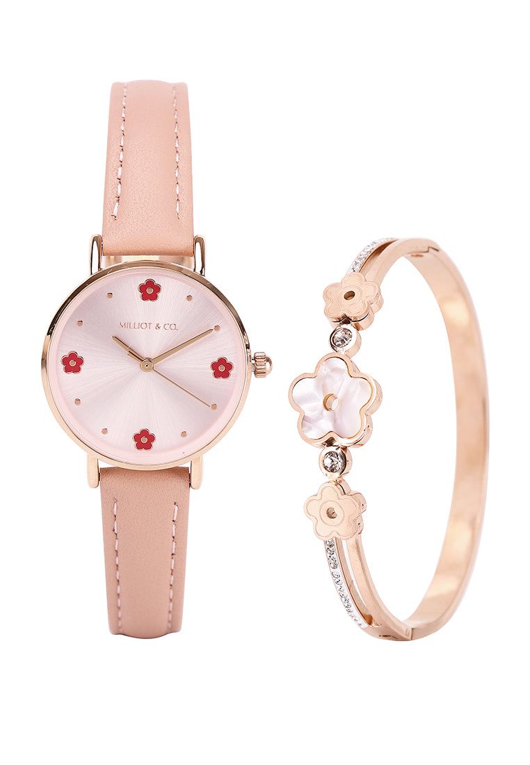 Embrace timeless elegance with our sophisticated round watch in a 30mm case, featuring a captivating flower graphic on the dial. Paired with a matching bangle set, it adds a playful and elegant touch to any outfit. Inspired by the delicate beauty of flowers, highlighted with subtle pink colors, this exquisite timepiece combines classic design with a touch of nature-inspired artistry, perfect for any occasion.