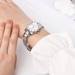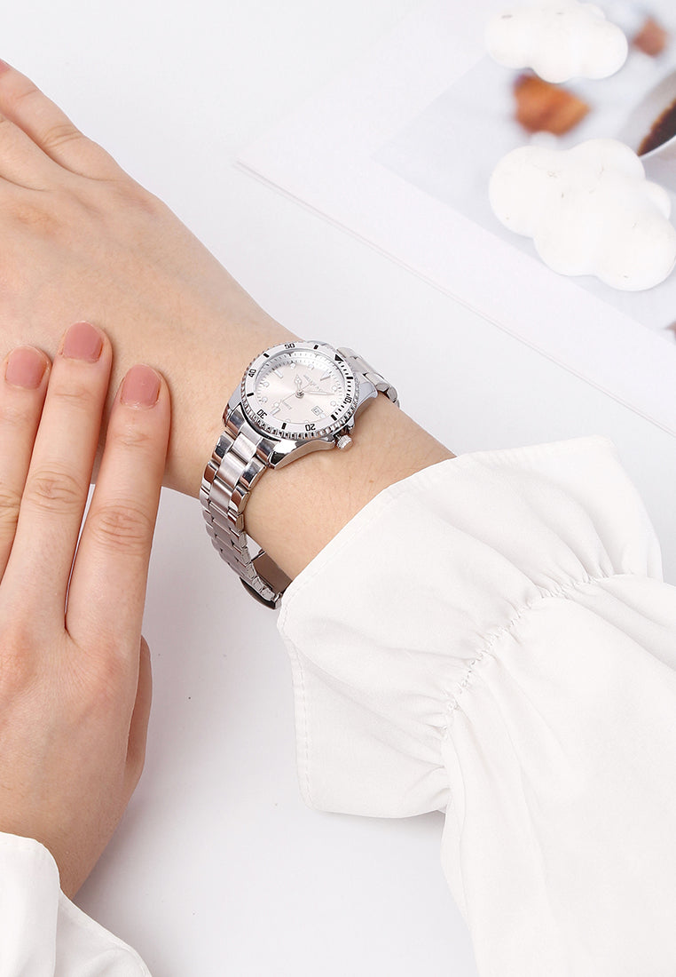 Combine elegance with a touch of sporty charm in the Victoria Silver Watch. This stunning timepiece features a round dial, a silver bezel, and a practical date function, perfectly blending feminine sophistication with a dynamic, athletic appeal.
